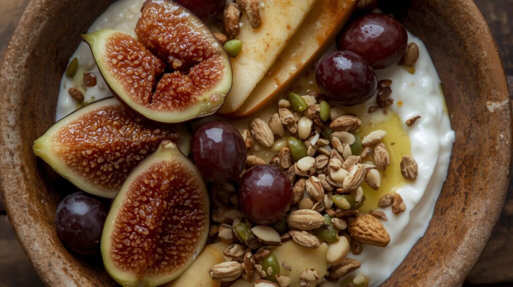 Esta es una opción sencilla, nutritiva y versátil que puedes disfrutar en el desayuno, la merienda o como cena ligera usando yogurt natural o de soja y frutas de temporada como son los higos, las manzanas, peras, uvas, … y frutos secos como avellanas, nueces etc.